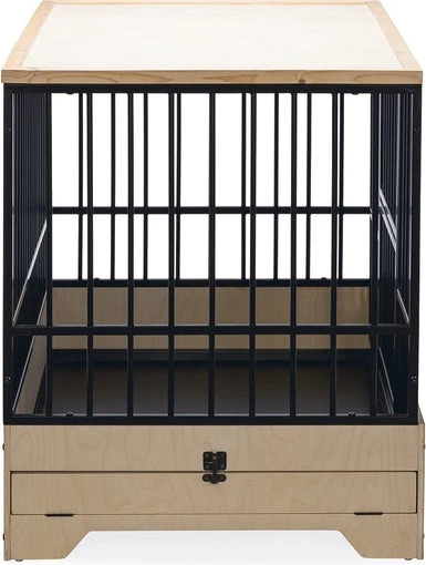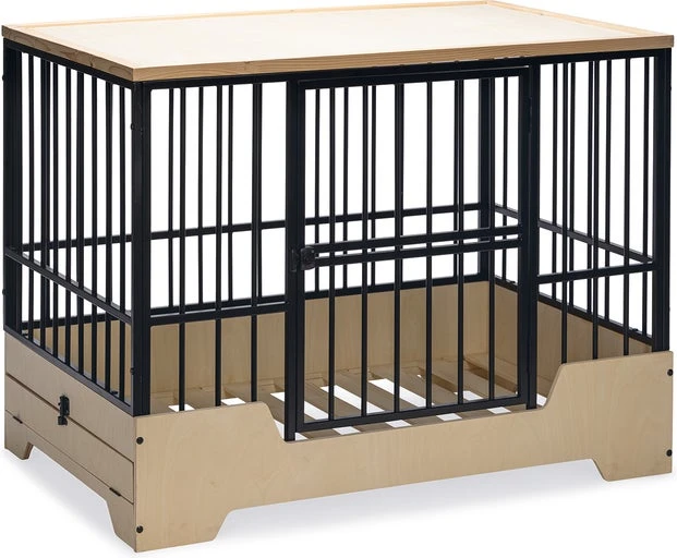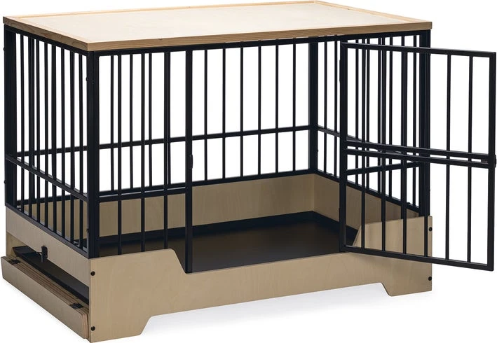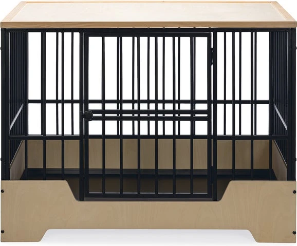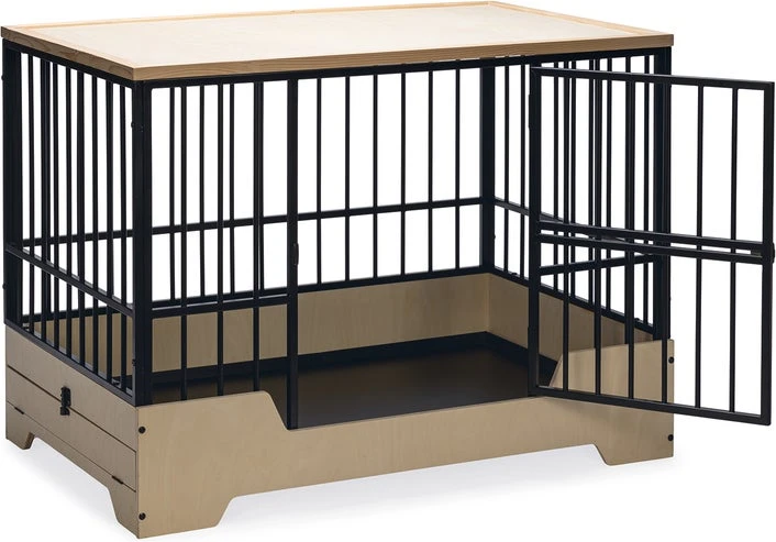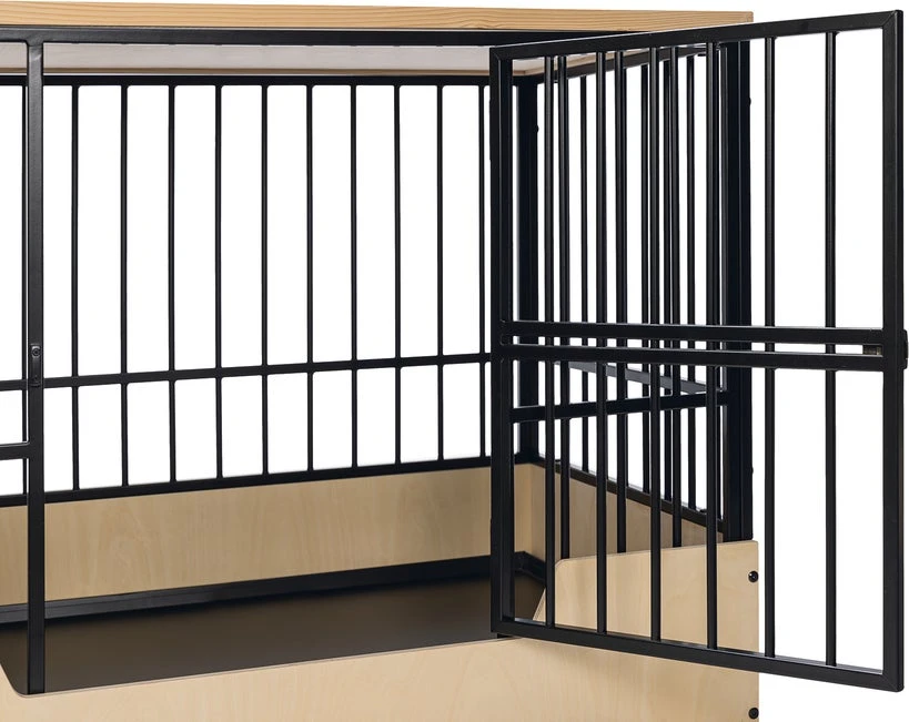 Geef jouw hond een prachtige eigen veilige omgeving die ook nog eens mooi staat binnen jouw interieur met deze Designed by Lotte hondenbench Quirine. De bench heeft een stevige metalen frame en een licht houten onder- en bovenkant. Daarnaast is de bench voorzien van een verhoogde instap en een deur aan de voorkant met een draaisluiting.